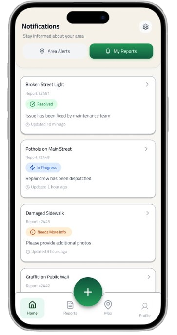 Track your report status from submission to resolution with detailed updates